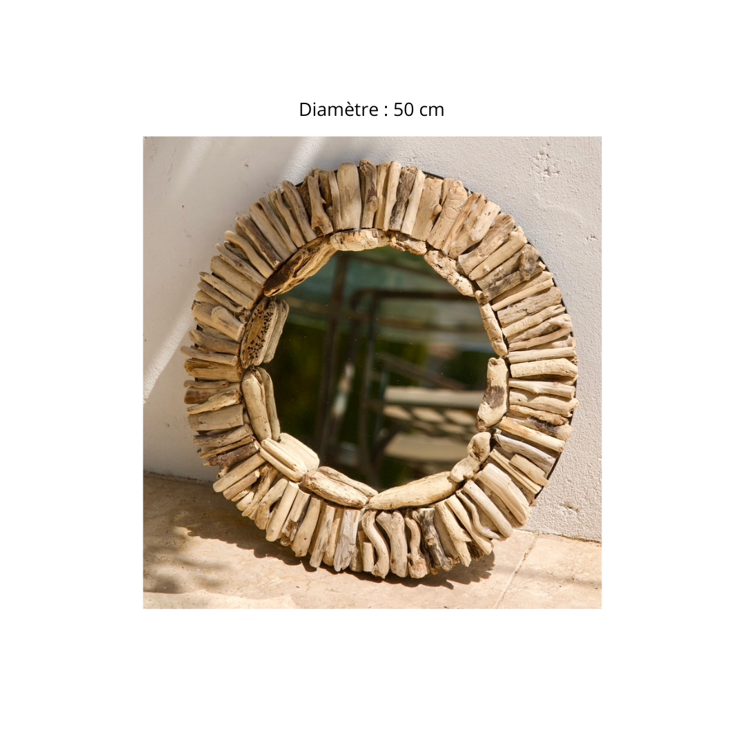 Apportez une touche de nature et de lumière à votre intérieur avec le miroir rond soleil "KUTA" en bois flotté naturel. Ce miroir unique, fabriqué à la main dans le Sud de la France, incarne l'authenticité et le charme du design artisanal. Avec son diamètre de 50 cm, il est parfait pour ajouter une note chaleureuse et moderne à votre salon, chambre, entrée ou même à un espace extérieur. Sa forme ronde évoque l'énergie et la beauté du soleil, faisant de lui un véritable élément décoratif et un symbole de lumière.
